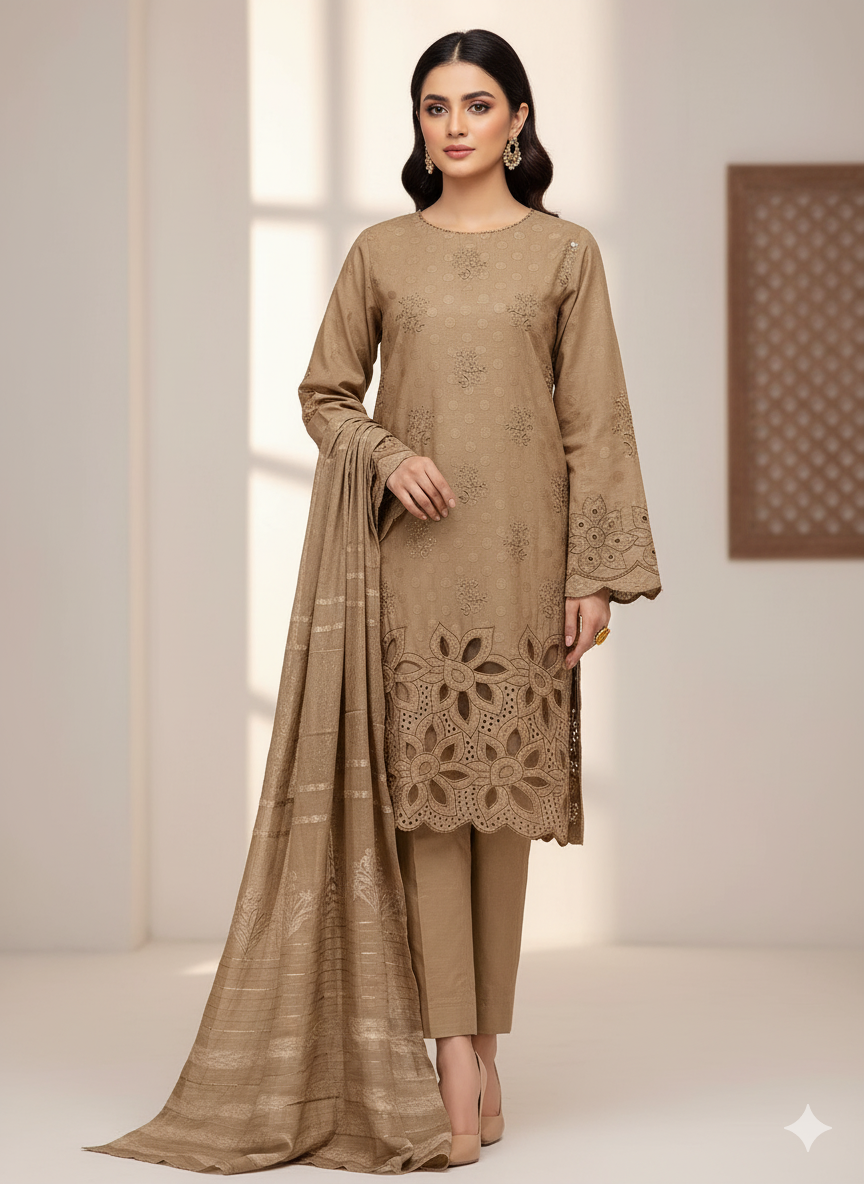Stay cozy and elegant this season with our premium 3-piece suit, crafted from soft Marina Dhanak wool. Perfect for winter wear, offering warmth with timeless style.