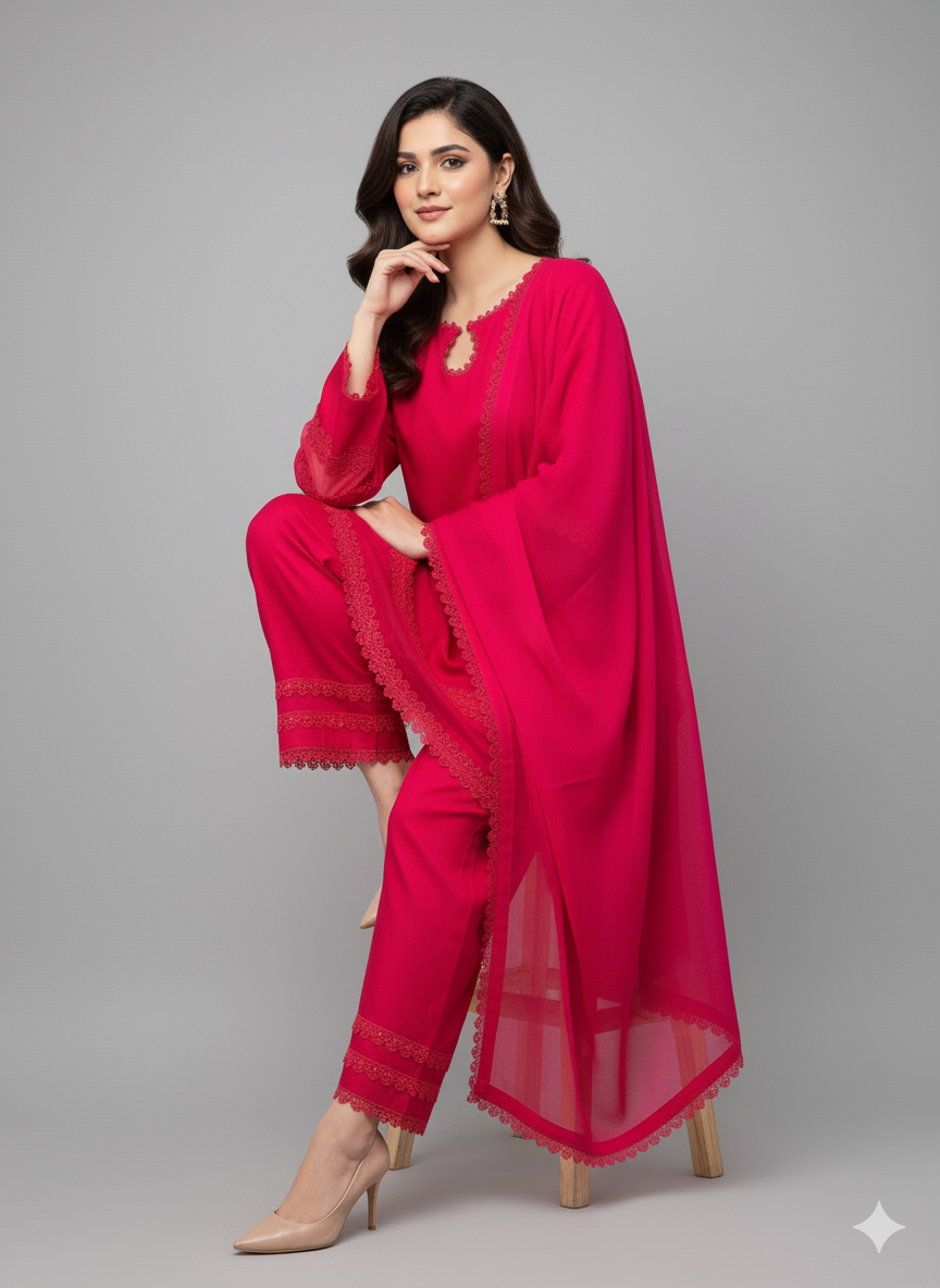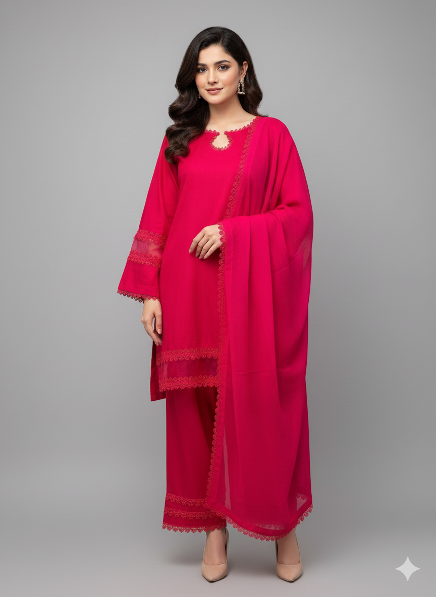 This 3-piece solid lawn stitched set is a timeless addition to your wardrobe. Crafted from premium-quality lawn, the outfit features a clean, minimalist design enhanced with delicate lace detailing for a subtle touch of charm.